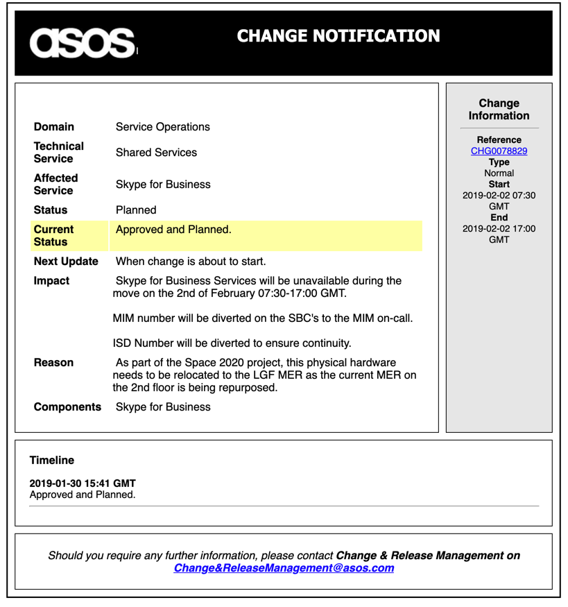 Working in a company the size of ASOS there are technical and physical changes happening daily, which will affect many employees in their day-to-day tasks. To correctly manage this and prevent any significant issues arising ASOS has a team that manages these changes and notifies everyone who could be affected by them.
